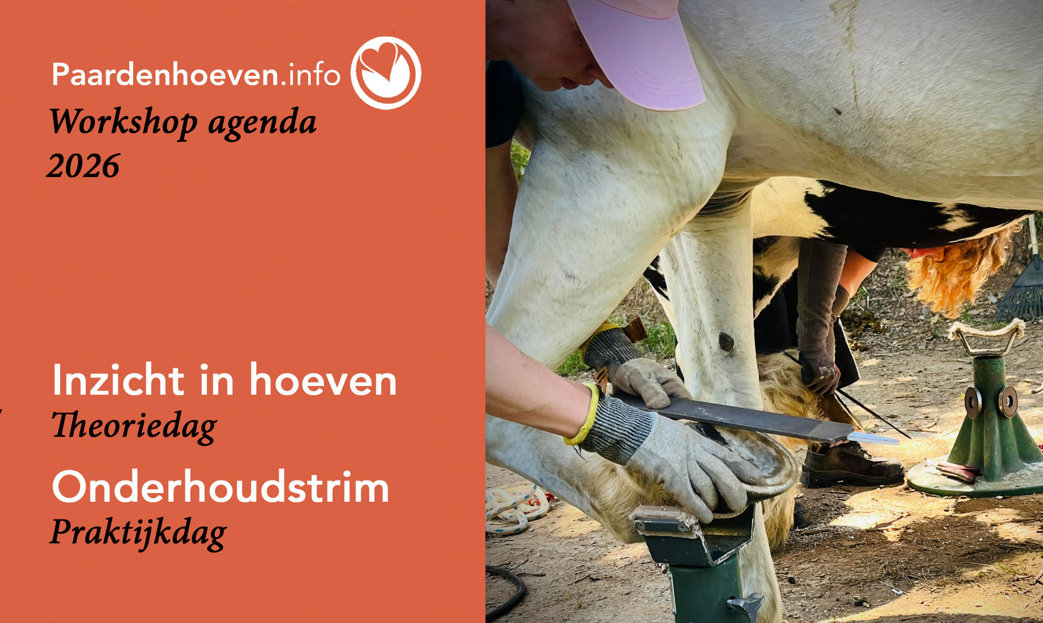 Met ‘theorie‘ wordt de workshop ‘Inzicht in hoeven‘ bedoeld. Kosten voor deze dag bedragen €90. Tijdens die dag leer je de hoef te begrijpen van binnen en buiten en worden de principes van het hoefonderhoud getoond tijdens een demonstratie hoefonderhoud.